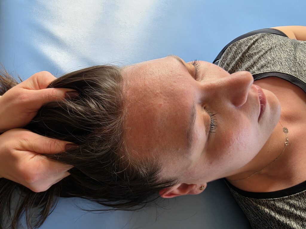 - Praca z twarzoczaszką: Ważne jest również opracowanie twarzoczaszki i napięć w obrębie stawów skroniowo-żuchwowych.